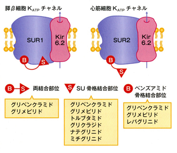 ATP依存性カリウムチャネルに存在するSU受容体の仕組みについて詳しく説明します。膵β細胞に存在するSUR1にはベンズアミド骨格に結合する部位とSU骨格に結合する部位があります。そのためグリベンクラミドとグリメピリドはSUR1に強く結合します。グリクラジドはSU骨格しか持たないため結合は強くありません。