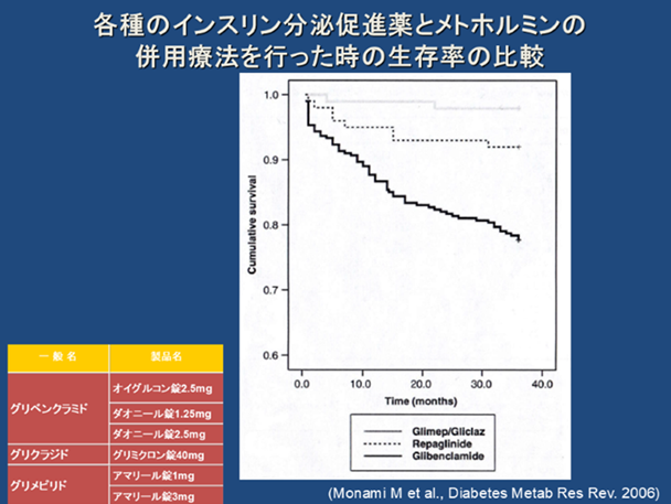 以上のことより、グリベンクラミドはSUR2に結合し、心筋細胞に影響を及ぼす可能性が捨てきれません。実際にグリメピリド/グリクラジドと比較してグリベンクラミドは内服開始後からの生存率が低いとする報告があります。(Monami M et al., Diabetes Metab Res Rev. 2006)