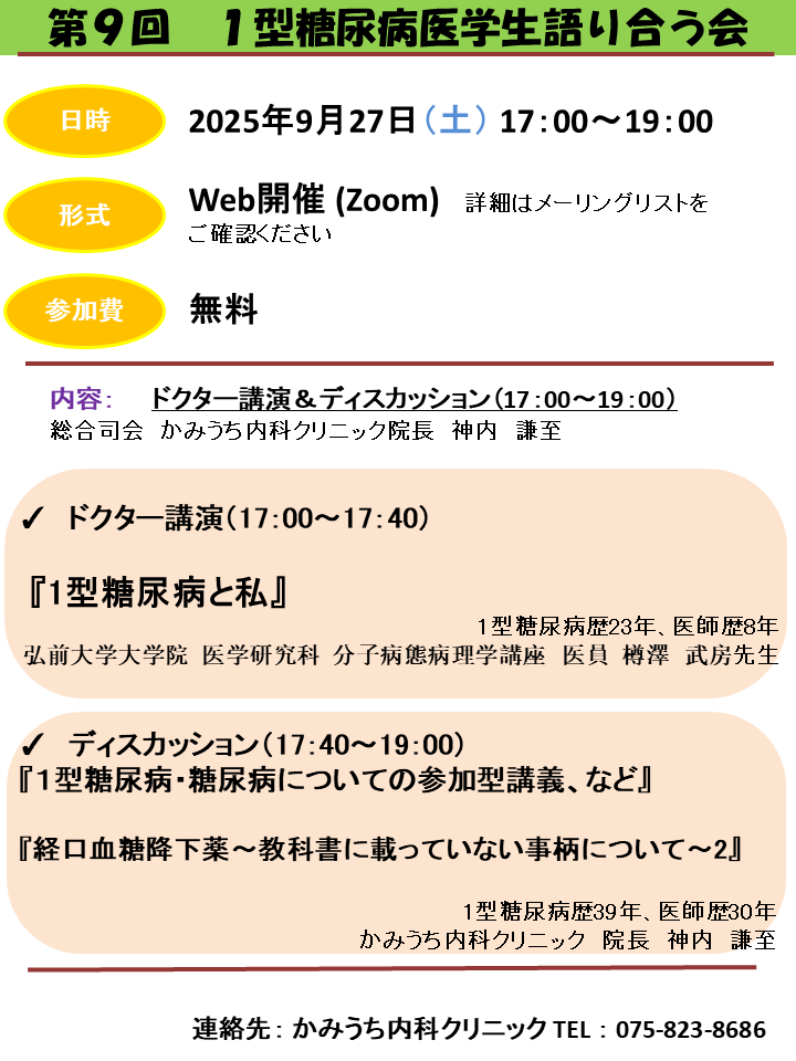 9月27日に、第9回1型糖尿病医学生語り合う会をzoomにて開催しました。今回の1型医学生は6名でした。今回も初参加が1名で、1型医学生は全国にたくさんおられます。頼もしい限りです。